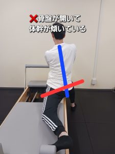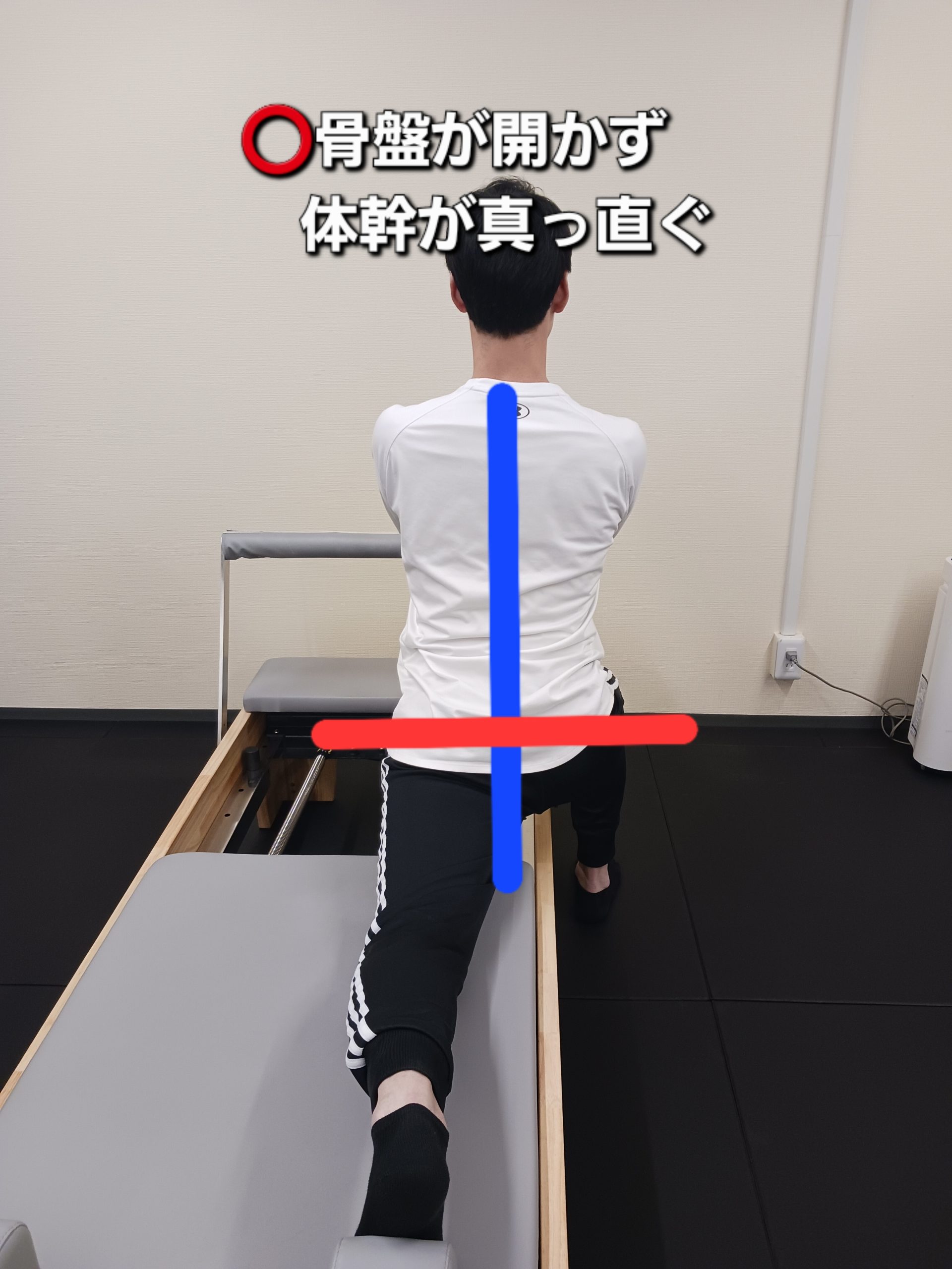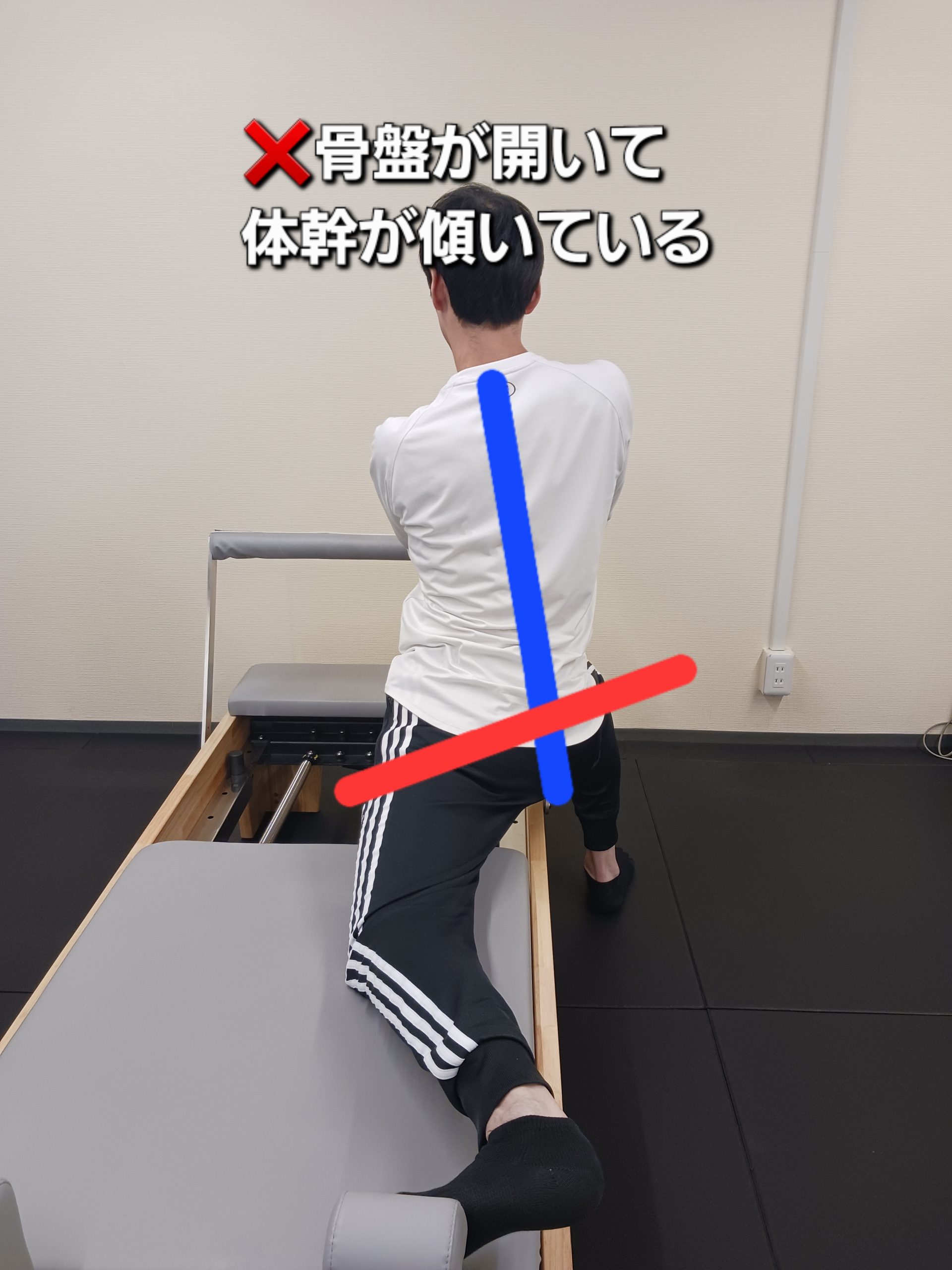 これはフォワードランジ初心者の方に多く見られる間違ったフォームで、太ももの前にストレッチをかけようと、頑張ってパッドを後ろに押し込もうとした際に、骨盤が開いてしまうというものです😣